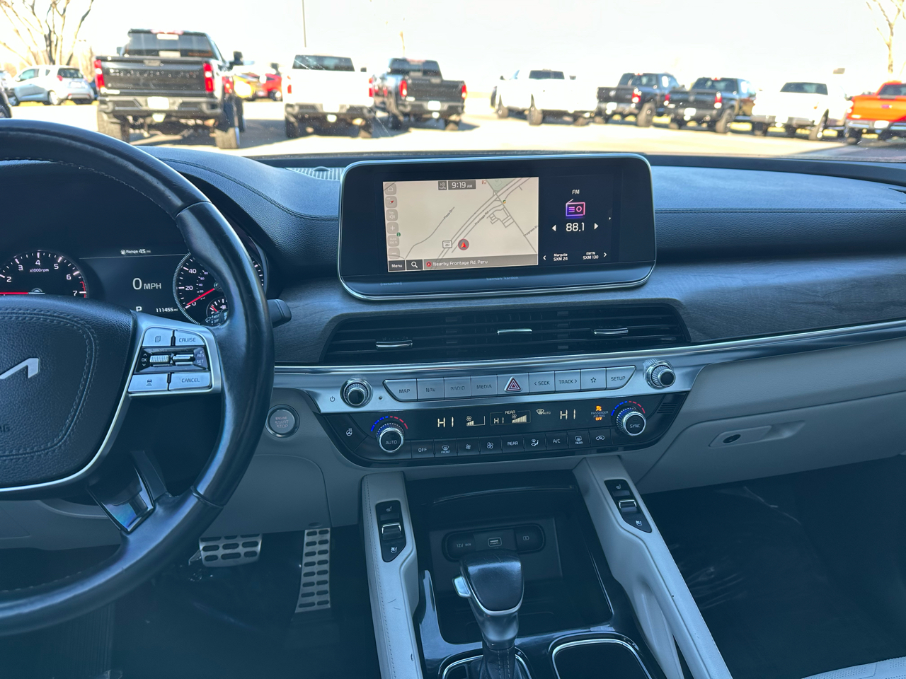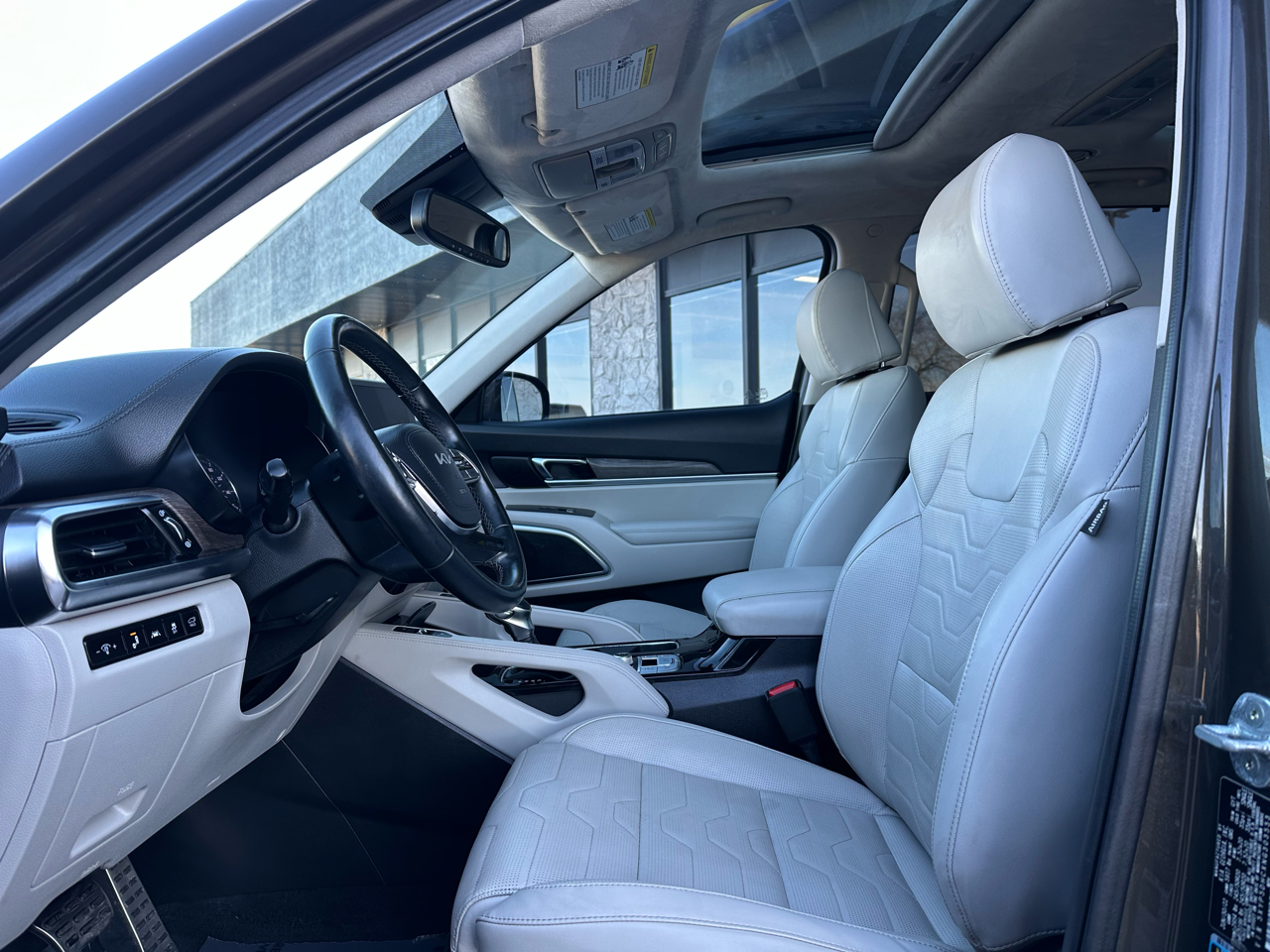 Kia Telluride SX V6 AWD in Bronze with a Gray interior. Inside, you'll enjoy Napa leather seating, heated and ventilated front seats, heated and ventilated 2nd-row captain's chairs, a premium Harman Kardon sound system, Head-Up Display, and a large touchscreen with Apple CarPlay/Android Auto. The cabin also features wireless phone charging, HomeLink, rain-sensing wipers, power driver's seat with memory, side-window sunshades, and tri-zone automatic climate control.